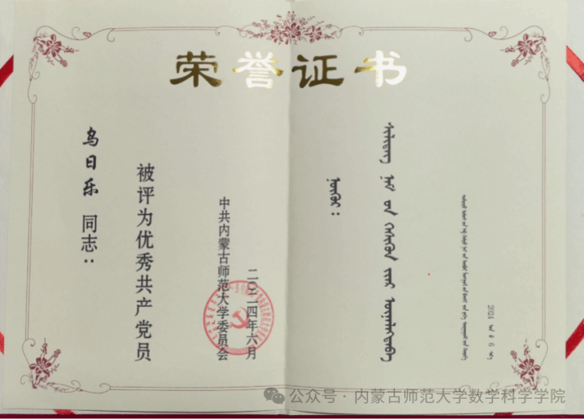 乌日乐,男,蒙古族,中共党员,sunbet申搏2024级博士研究生,专注于数学与人工智能交叉领域的研究,现任sunbet申搏博士研究生党支部组织委员。在校期间,他始终以“德才兼备、全面发展”为准则,在思想淬炼、学术科研、竞赛实践、志愿服务等方面表现突出,充分展现了新时代青年党员与研究生的责任担当和昂扬向上的精神风貌。2025年10月荣获全区高校党建“双创”研究生党员标兵荣誉称号。