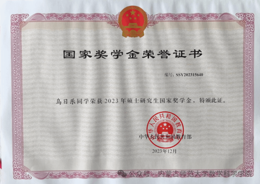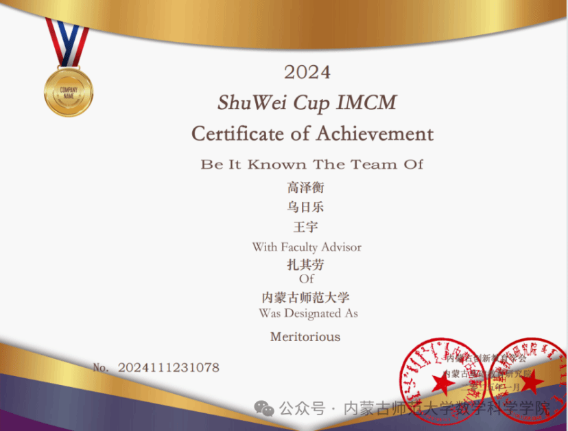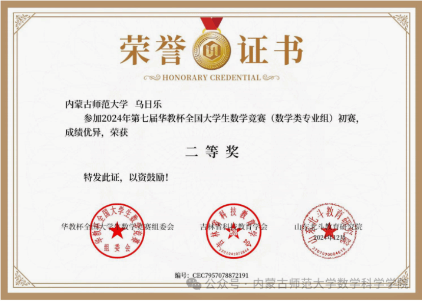 在深耕科研的同时,乌日乐注重理论与实践融合,主动投身高水平学科竞赛,以赛促学、以赛提能。先后获得第十届“数维杯”国际大员工数学建模挑战赛一等奖、第七届“华教杯”全国大员工数学竞赛(数学类专业组)初赛二等奖,展现出扎实的学科素养和创新能力。