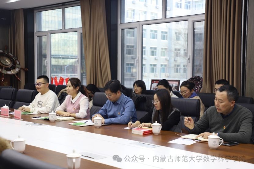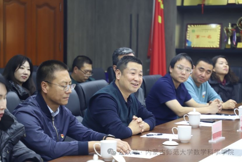 随后,自治区应用数学中心党支部书记刘勇波,系主任范鹏程和布和额尔敦三位老师分别介绍了相关学科发展情况。刘勇波老师从中心发展历程和党支部建设定位出发,介绍了围绕自治区“两个屏障”“两个基地”“一个桥头堡”战略定位,在语言智能化、遥感数学方法、新能源规划等方向的研究进展。范鹏程老师就信息与计算科学专业的人才培养、课程建设及产教融合实践作了说明。布和额尔敦老师介绍了统计系的发展历程、师资结构、课程体系及科研项目等情况。