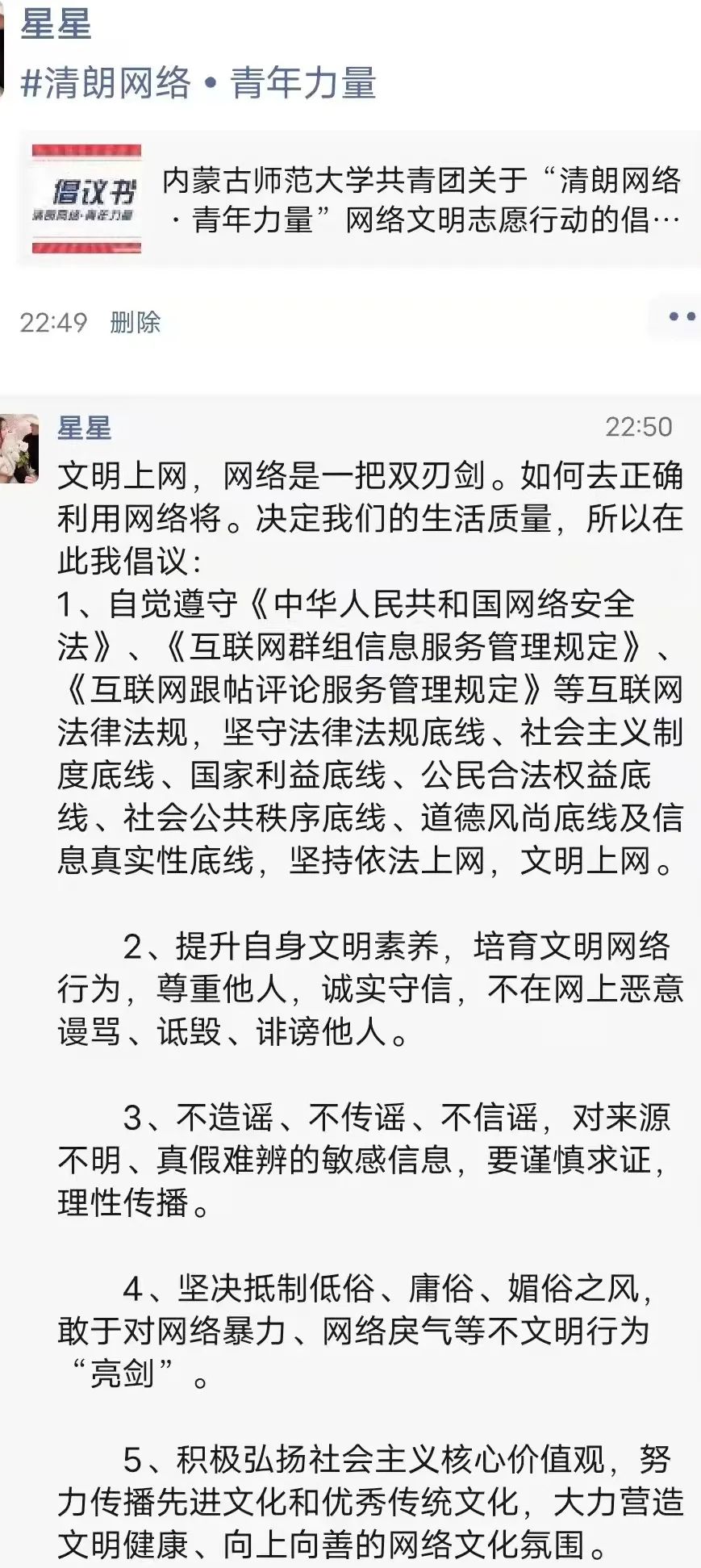 为进一步贯彻落实习近平总书记和党中央的重要要求,动员广大团员青年积极参与构建清朗网络空间,sunbet申搏组织各班进行了“清朗网络,青年力量”主题活动,号召大家积极按照习近平总书记提出的“勤学、修德、明辨、笃实”要求,将共青团员的先进性和担当精神延伸到网上,在网上积极发出青年好声音、形成强劲青春正能量。