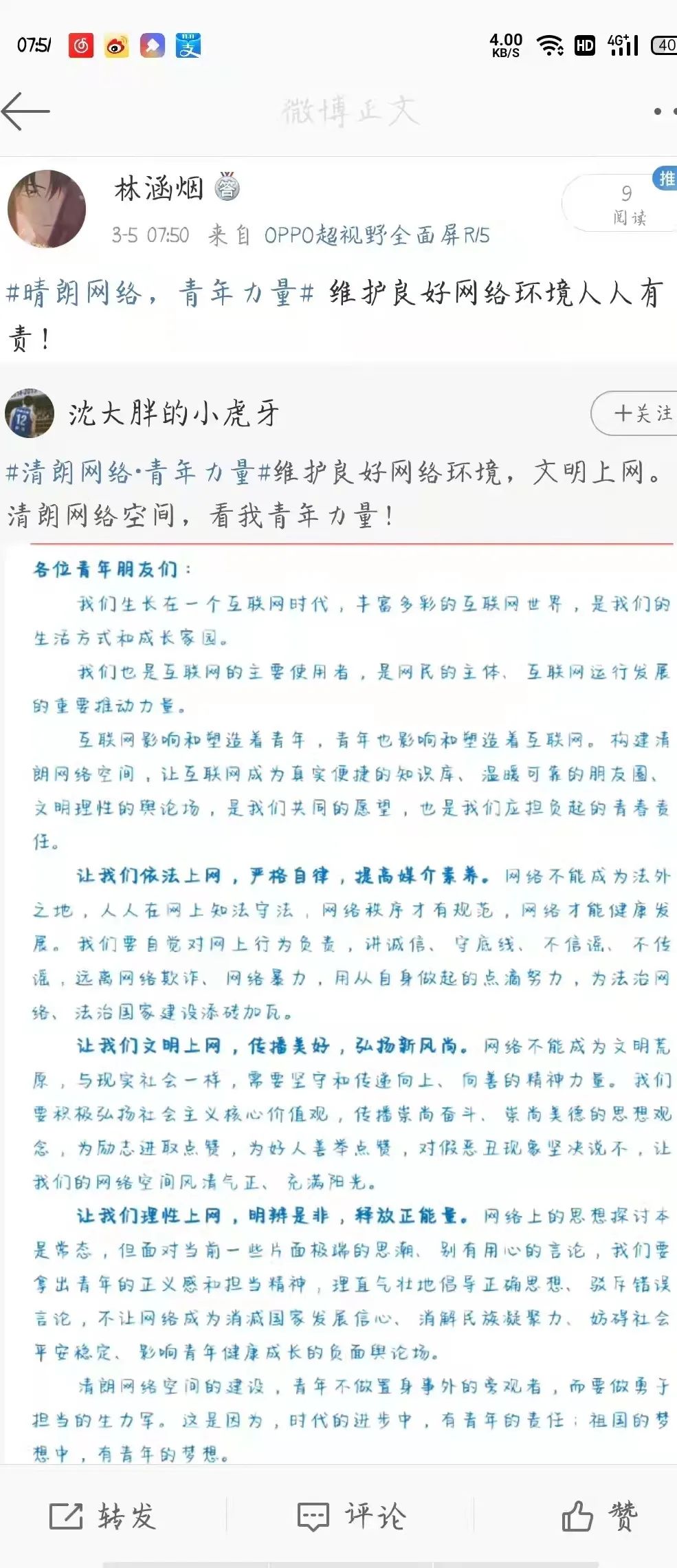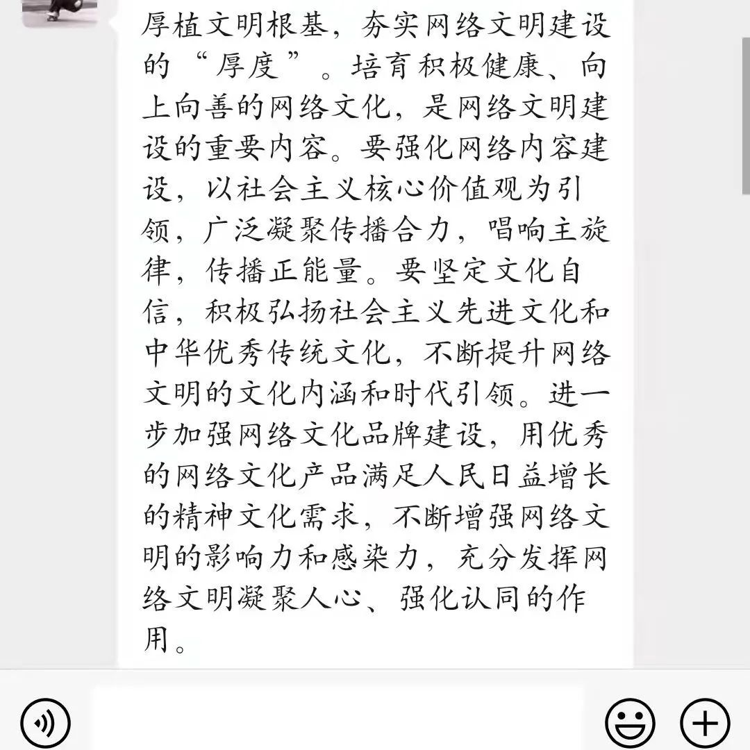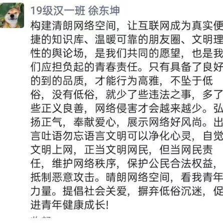 "清朗网络空间的建设,青年不做置身事外的旁观者,而要做勇于担当的生力军。这是因为,时代的进步中,有青年的责任;祖国的梦想中,有青年的梦想。清朗网络空间,看我青年力量!"