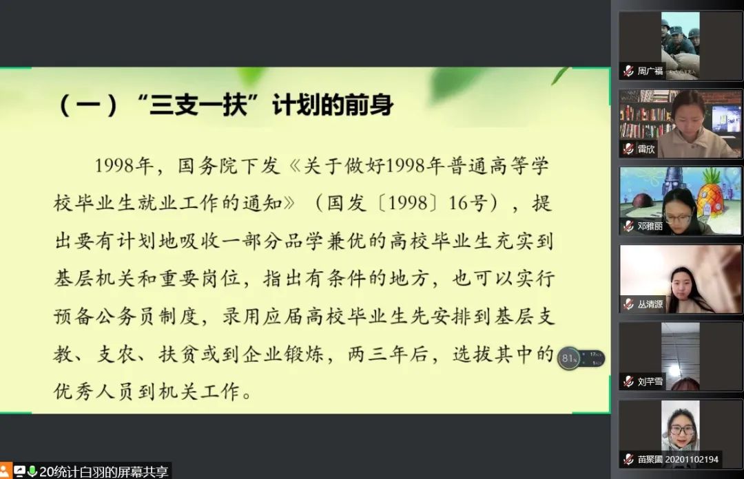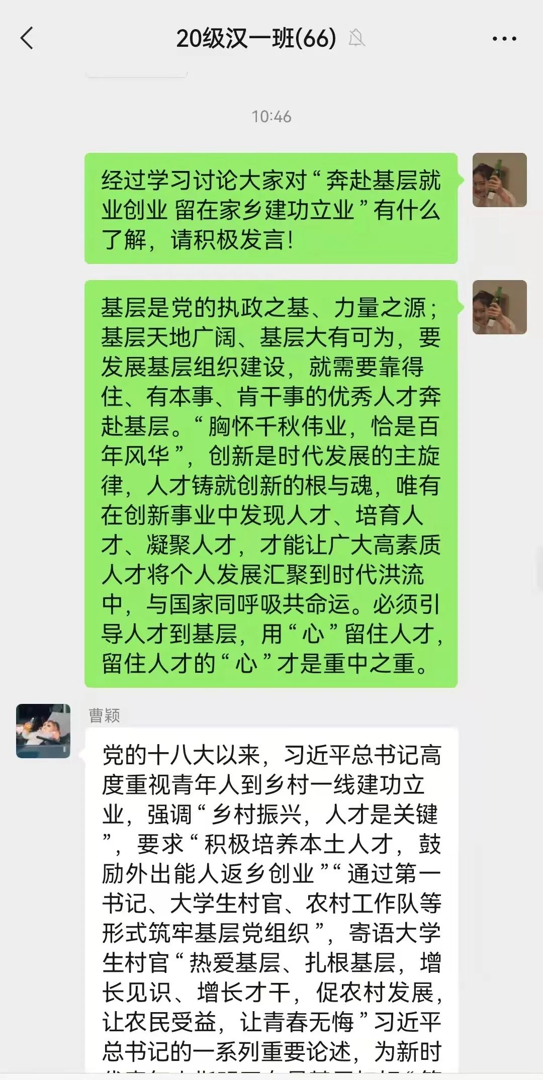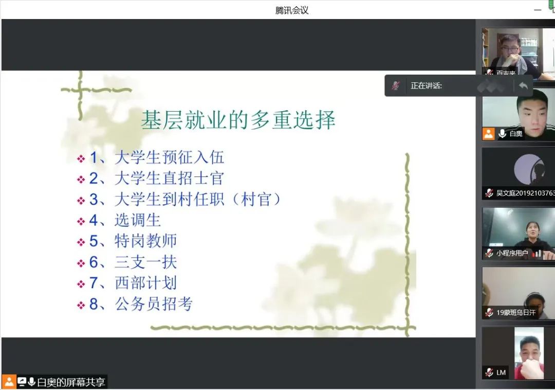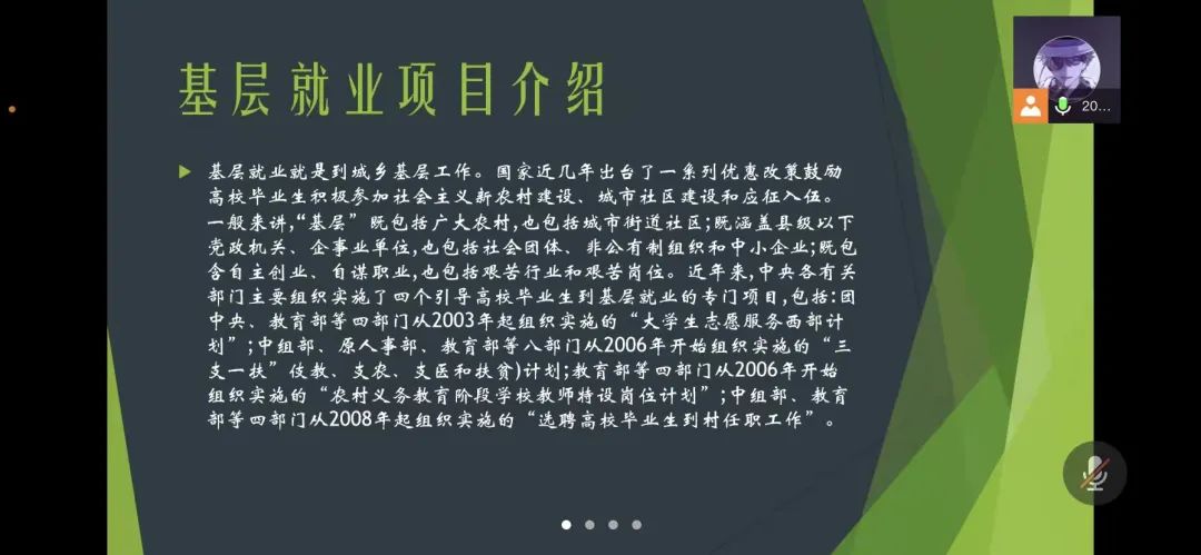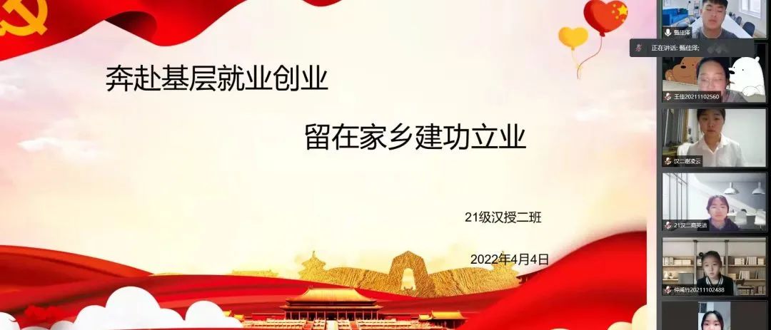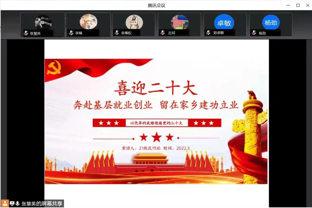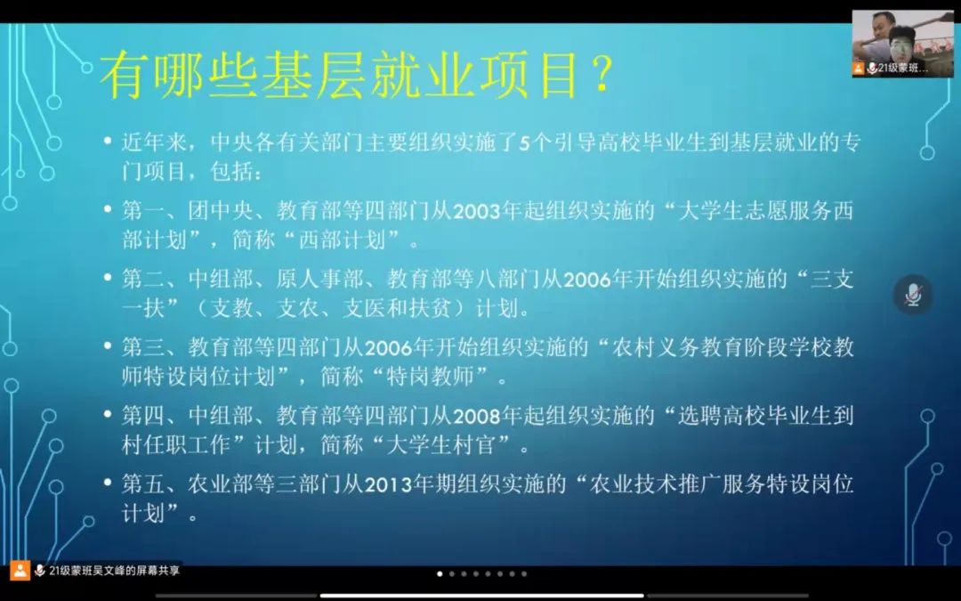 国家近几年出台了一系列优惠政策鼓励高校毕业生积极参加社会主义新农村建设、城市社区建设。为进一步让同学们了解基层就业,sunbet申搏各班级开展“奔赴基层就业创业,留在家乡建功立业”线上主题班会,针对基层就业的项目类型,优惠政策等内容进行学习,在充分理解基层就业扶持政策的基础上引导各班同学们加入基层就业。