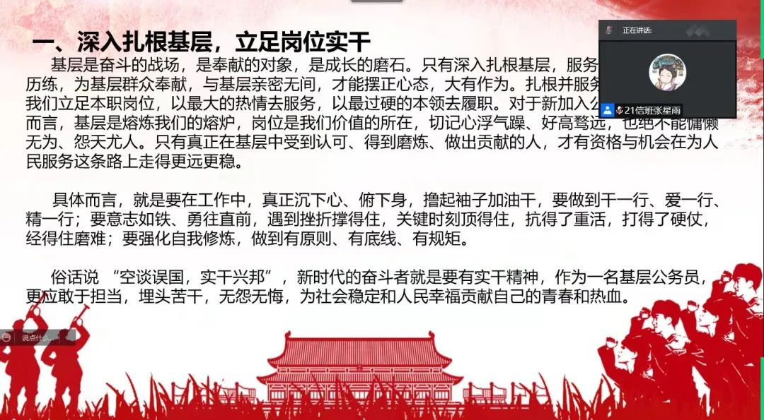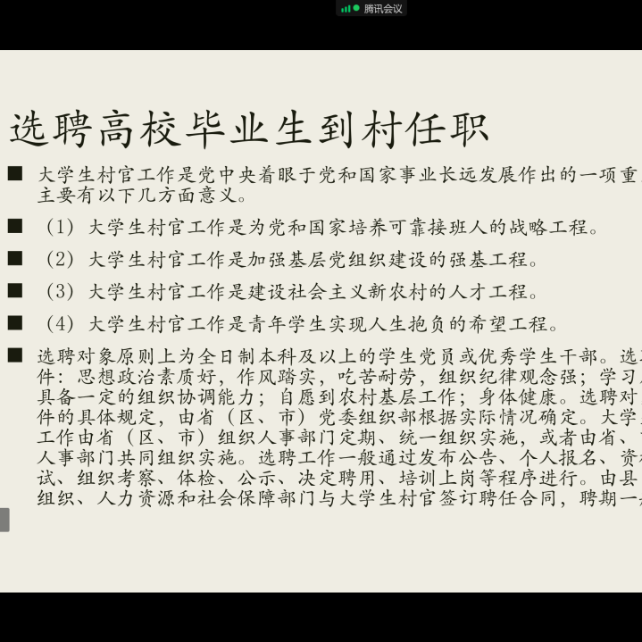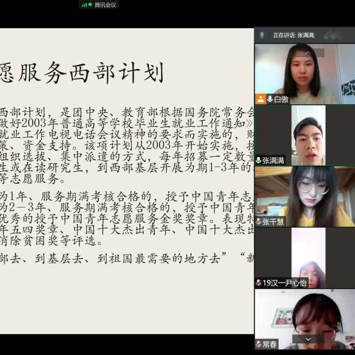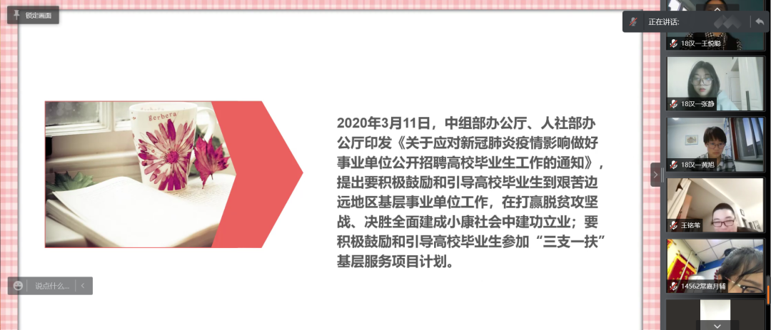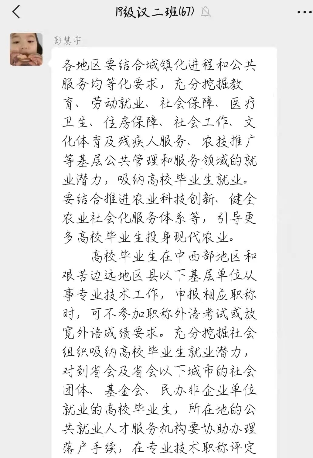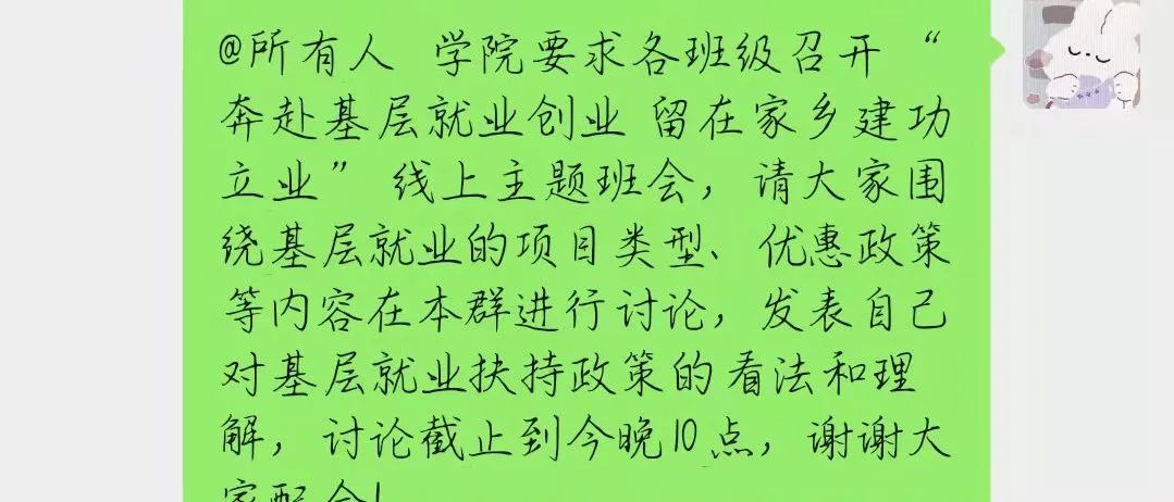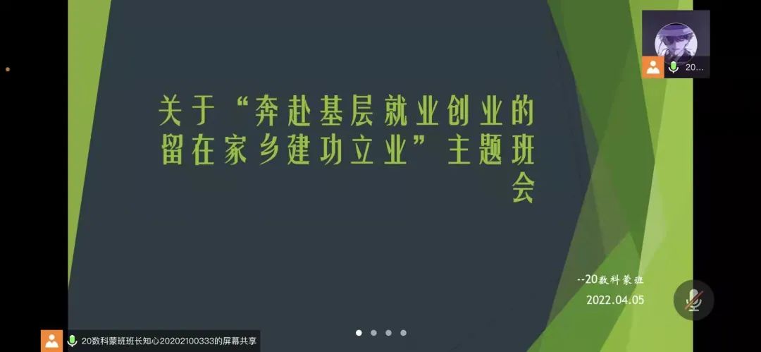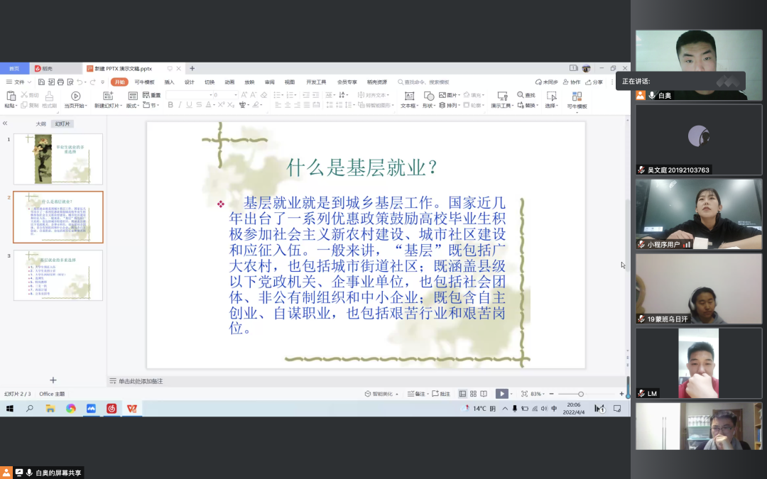 国家近几年出台了一系列优惠政策鼓励高校毕业生积极参加社会主义新农村建设、城市社区建设。为进一步让同学们了解基层就业,sunbet申搏各班级开展“奔赴基层就业创业,留在家乡建功立业”线上主题班会,针对基层就业的项目类型,优惠政策等内容进行学习,在充分理解基层就业扶持政策的基础上引导各班同学们加入基层就业。
