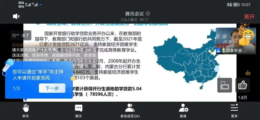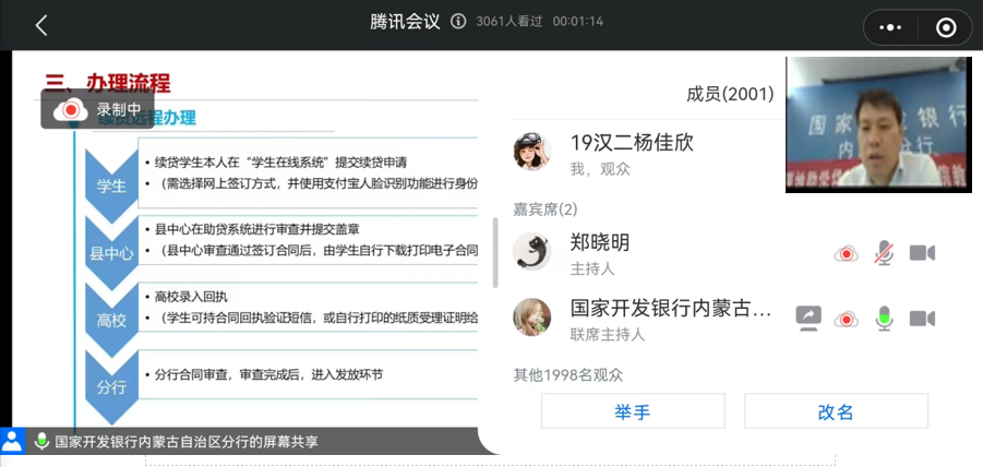 特邀国家开发银行工作人员在线上为我校师生进行以助学贷款业务政策介绍和金融知识普及的专题讲座,引导员工珍爱信用、理性借贷,提高员工征信意识、金融意识、风险意识、法律意识,增强责任感,帮助员工树立正确的消费观、价值观、荣辱观。