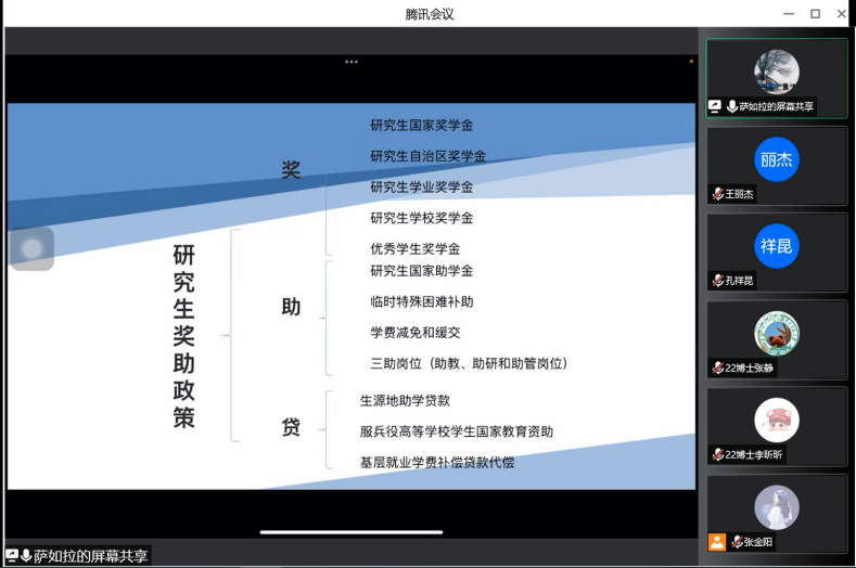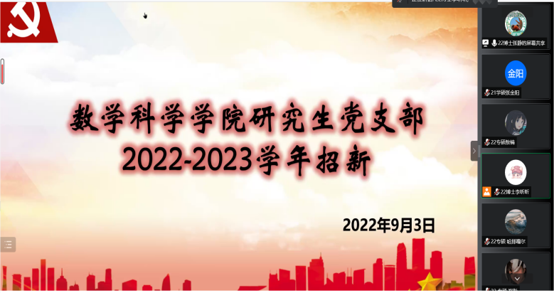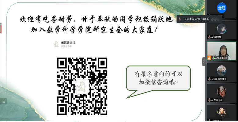 2022年9月3日晚20:30,sunbet申搏举办了线上新老生见面交流会,两校区全体研究生参加此次活动,活动由20级学硕李昕昕同学主持。张静同学、李颖同学、李昕昕同学分别对公司研究生党支部、研究生团支部、研究生会分别做了介绍及招新安排,同时希望同学们积极参加员工组织,在学习生活之余提升自己各方面能力。