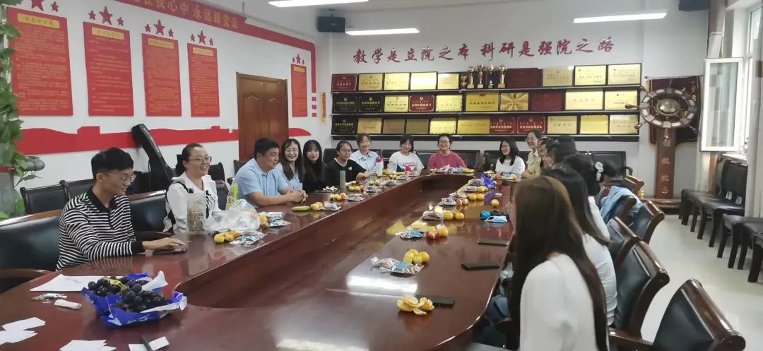 在公司楼的会议室里,22级研究生欢聚一堂,副书记、副院长季建光老师和学就办副主任刘沙沙老师代表公司向研究生送来中秋节的慰问。