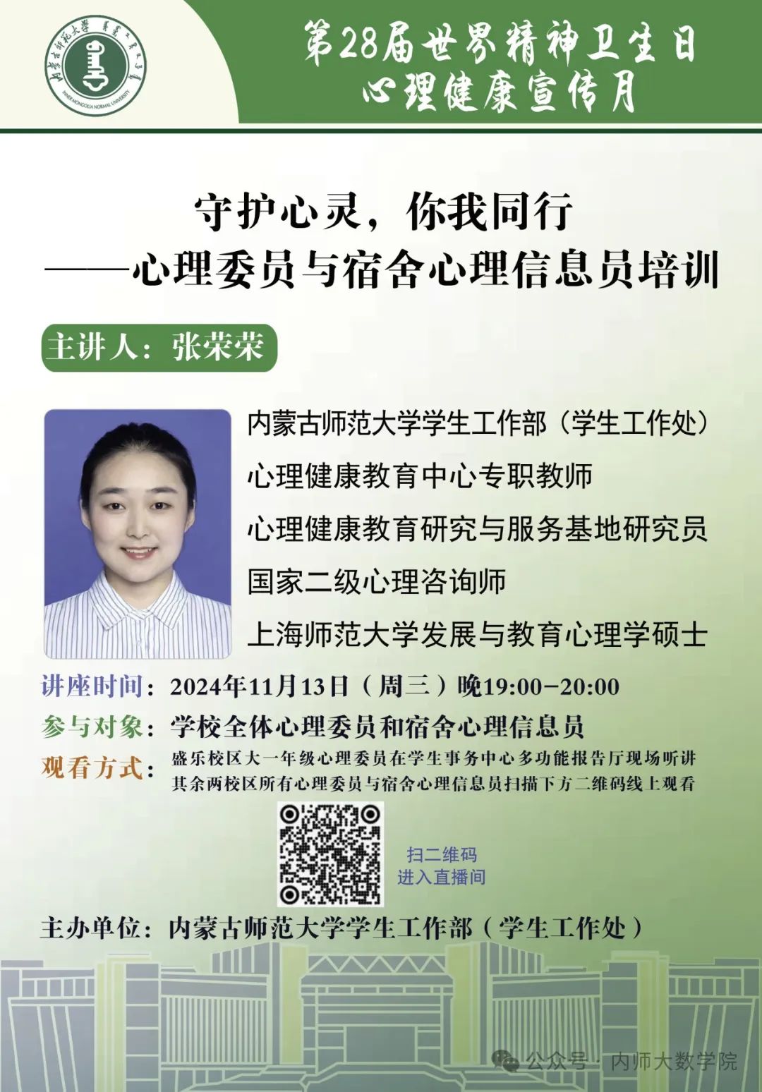 本次培训由心理健康教育中心专职员工、心理健康教育研究与服务基地研究员、国家二级心理咨询师、上海师范大学发展与教育心理学硕士张荣荣老师主讲,为大家带来一场心灵的滋养之旅。
