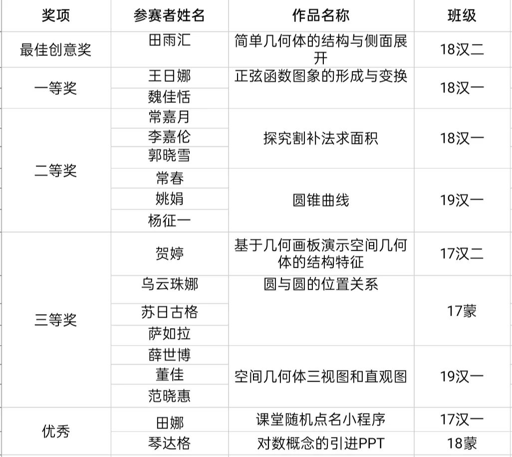 毕力格图老师讲到,教具在数学课上起着举足轻重的作用,很多知识员工理解起来很困难,但通过教具演示,容易理解,便于教学。老师肯定了同学们对比赛的努力,也指出了选手们存在的不足,一些参赛作品只是对应用软件的简单应用,缺少创新,希望同学们之后可以不断优化完善作品,以后可以真正运用到工作实践中去。