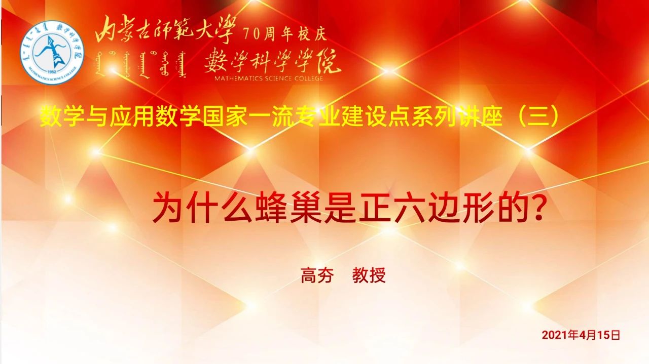 高夯老师在讲座中谈到:研究数学40年,最快乐的事情就是和同学交流。在讲解“为什么蜂巢是正六边形”这个问题的过程中,高老师循循善诱提出问题,同学们认真思考,积极和老师互动,共同感受数学的魅力。讲课过程中,高夯老师鼓励同学们勤学好问,多动脑筋多思考,要有自己的思想。