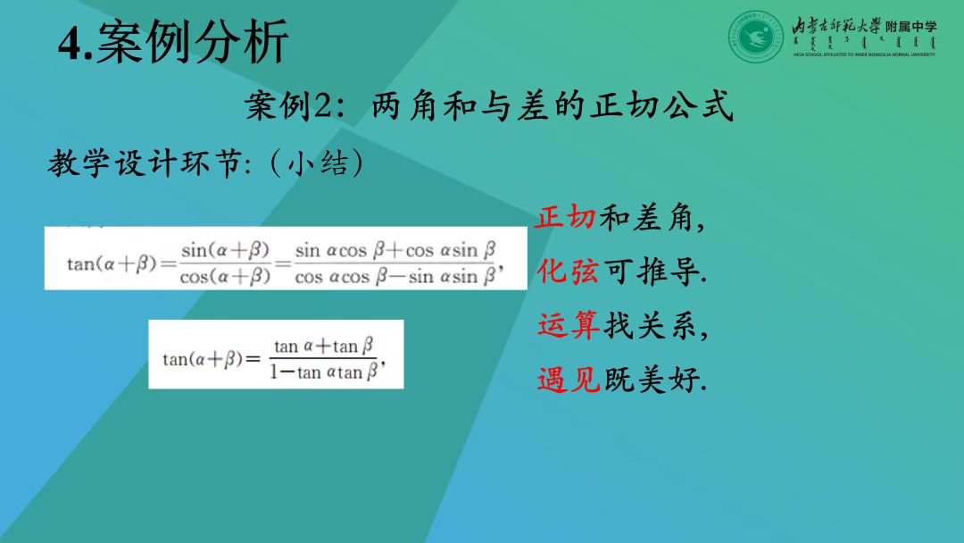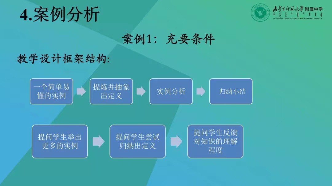 在给出如何备课的理论基础后,张生老师以《充要条件》和《两角和与差的正切公式》这两个真实案例向我们具体的展示了他是如何“用艺术的眼光备课”的。张生老师备课思路灵活又严谨,不乏趣味性,完美地体现了“用教材教”而不是“教教材”,每每到课堂的最后,总以精美的数学诗句、押韵的语句等提炼整节课的核心知识方法与思想,他的课如一个个艺术品一样,赏心悦目的同时,又能让员工满载而归。