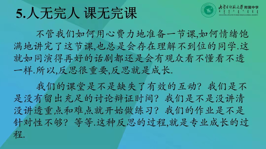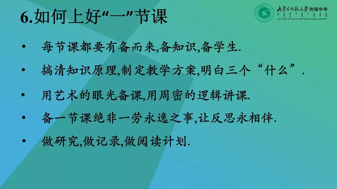 案例分析后,张生老师总结出年轻员工如何上好“一节课”所必须遵循的5条原则,人无完人,课无完课,我们应该要有用一辈子备课的精神。虽然我们青年员工尚且达不到这种境界,但是,我们应该心中有理想、有态度、有责任和追求,不断打磨自己的课堂,向着心中的“艺术品”靠近!