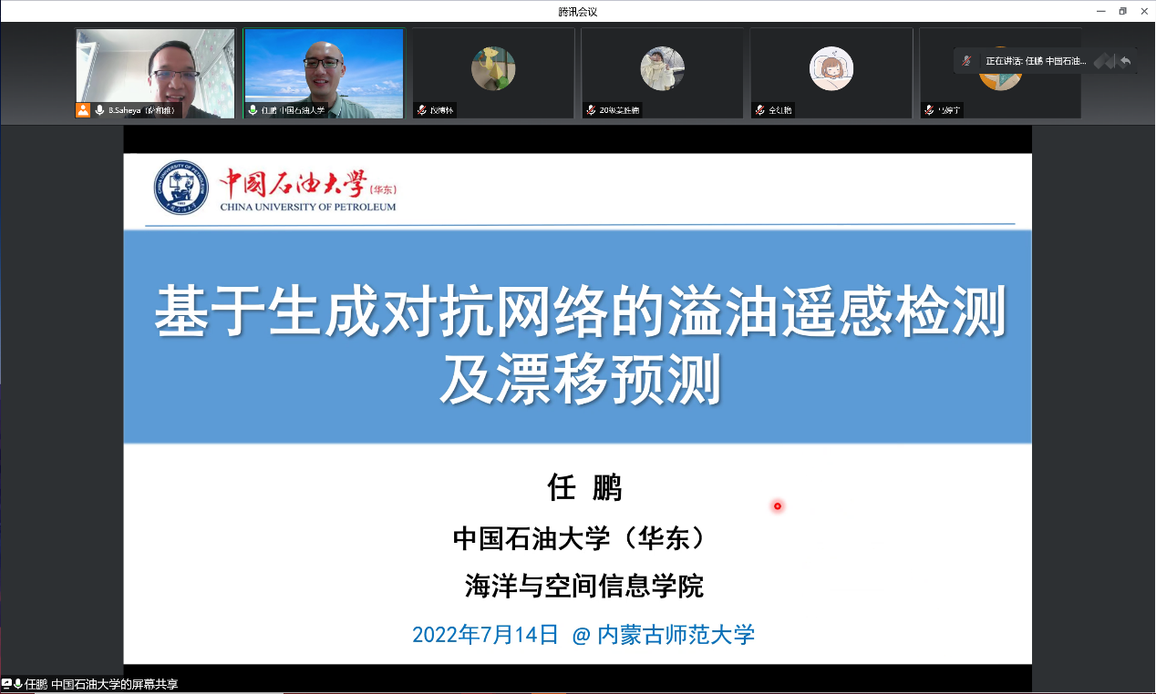 2022年7月14日上午8:30-10:00,sunbet申搏以线上会议的形式举办了迎校庆70周年暨内蒙古自治区应用数学中心系列讲座。特邀请中国石油大学(华东)教授,博士生导师,青岛市“海洋灾害预防检测信息国际联合研究中心”主任任鹏作了题目为“基于生成对抗网络的溢油遥感检测及漂移预测研究”的报告。本次讲座由高性能计算中心主任萨和雅主持,相关方向的员工、研究生和本科生听了本次报告。
