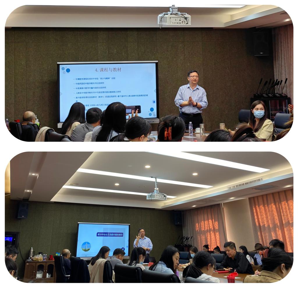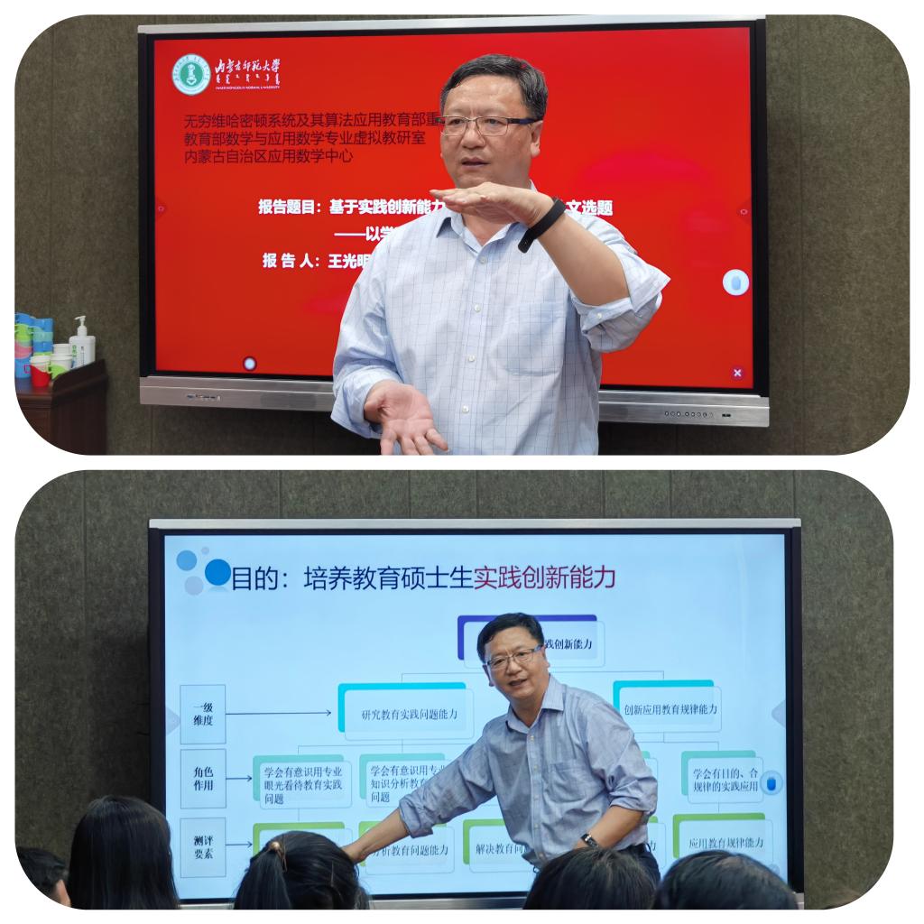 5月3日下午,sunbet申搏举办员工教育名家系列学术讲座,邀请到国务院学位委员会全国教育专业教育指导委员会委员、教育部高等学校(教育学类)专业教学指导委员会委员、教育部高等学校中学员工培养教学指导委员会委员、教育部普通高等学校师范类专业认证专家委员会学术委员会委员、教育部基础教育教学指导委员会数学专委会委员、《数学教育学报》和《中等数学》主编、天津师范大学教育学部部长、博士生导师王光明教授作了题为“基于实践创新能力的教育硕士学位论文选题—以学科教学(数学)为例”的学术讲座。讲座由sunbet申搏李春兰教授主持。相关专业的员工、研究生和本科生聆听了讲座。