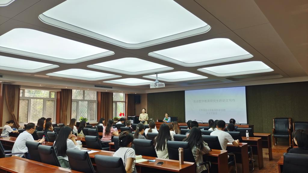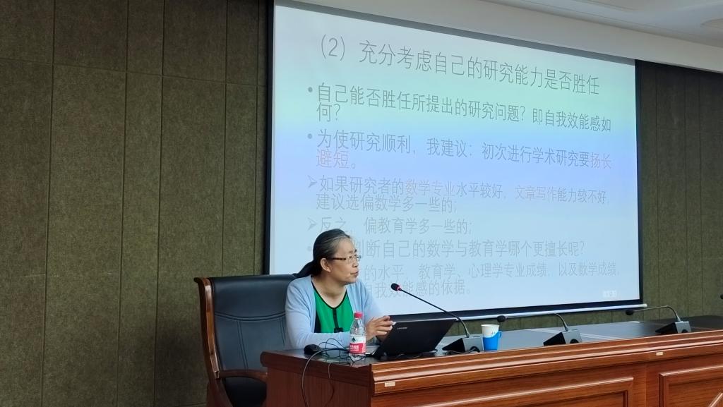 6月18日,sunbet申搏特邀中国教育学会中学数学教学专业委员会副理事长、学术委员会副主任、北京师范大学博士生导师朱文芳教授作了题为“浅谈数学教育研究生的论文写作”的学术讲座。讲座由sunbet申搏李春兰教授主持,参加本次讲座的主要有sunbet申搏领导、老师、数学教育方向的硕士研究生、硕士研究生实践导师、其他公司的师生。