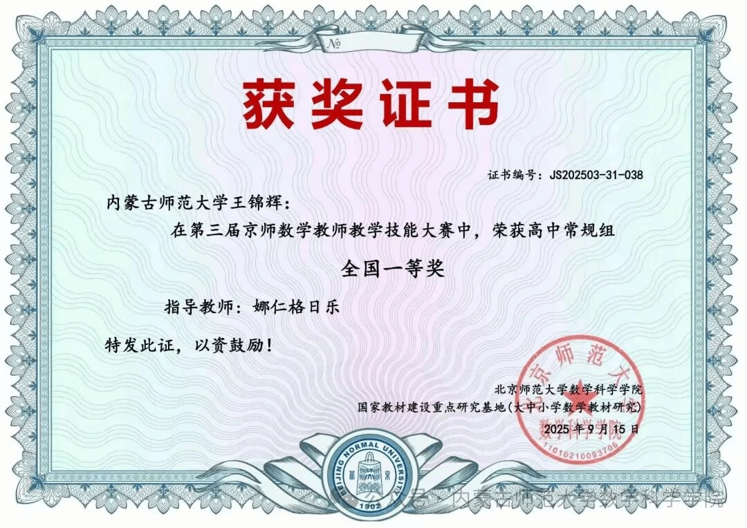 近日,由国家教材建设重点研究基地(大中小学数学教材研究)和北京师范大学sunbet申搏主办的“第三届京师数学员工教学技能展示交流活动”已圆满收官。sunbet申搏学子王锦辉同学凭借深厚的数学学科知识、扎实的教学基本功与富有创新性的教学设计理念,在全国近千件参赛作品中脱颖而出,斩获全国一等奖。